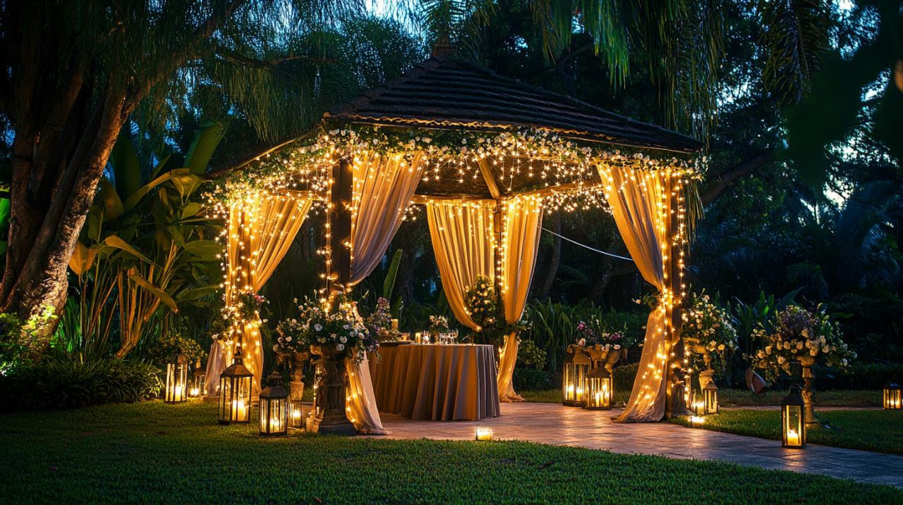 La décoration de votre gloriette joue un rôle déterminant dans l'atmosphère que vous souhaitez créer pour vos événements. Les plantes grimpantes constituent un élément de décoration jardin particulièrement efficace, transformant progressivement la structure en un pavillon verdoyant qui s'intègre naturellement dans son environnement. Rosiers grimpants, glycines ou clématites apportent couleur et parfum tout en créant une intimité supplémentaire. Le treillage peut être utilisé pour guider ces végétaux et structurer visuellement l'espace. L'éclairage extérieur revêt une importance capitale pour les soirées, avec des guirlandes lumineuses suspendues créant une ambiance féerique, ou des lanternes positionnées stratégiquement pour un effet plus classique. Des jardinieres positionnées aux entrées de la gloriette permettent de délimiter l'espace tout en ajoutant des touches florales saisonnières. Pour les événements, pensez à adapter la décoration selon l'occasion : des accessoires en fer forgé pour une ambiance rustique chic, des textiles légers et colorés pour une atmosphère méditerranéenne, ou des éléments plus épurés pour un style contemporain. Le mobilier de jardin résistant aux intempéries garantit que votre aménagement reste impeccable même après plusieurs saisons d'utilisation.