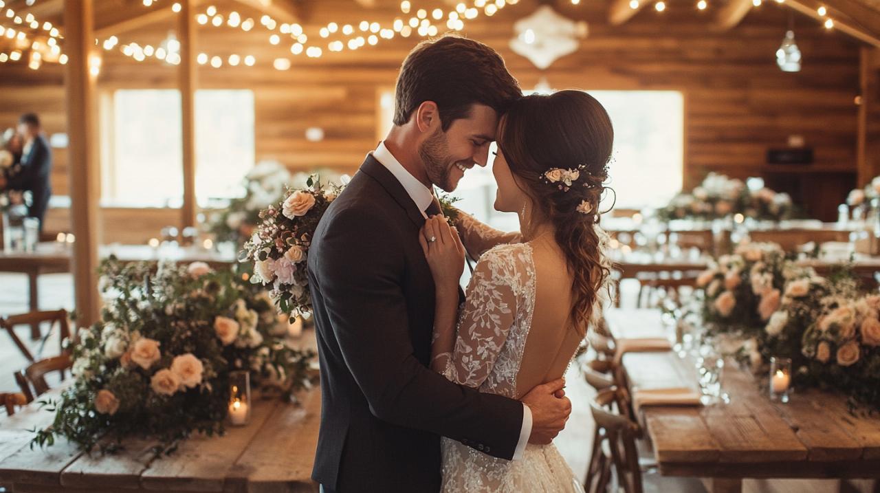 Le choix du traiteur mariage représente une décision stratégique qui influencera grandement la satisfaction de vos invités. Pour un mariage champêtre authentique, privilégiez un menu traditionnel composé de plats copieux faits maison comme du poulet frit, de la purée de pommes de terre crémeuse et des légumes de saison cueillis localement. Accompagnez ces mets de bières locales et de limonades artisanales pour une touche régionale appréciée. Si vous préférez une approche moderne rustique chic, optez pour des préparations raffinées utilisant des ingrédients frais et locaux, tels que l'agneau en croûte d'herbes ou le bar grillé, servis avec des cocktails artisanaux. Concernant la décoration mariage, intégrez massivement les éléments naturels bruts caractéristiques du style rustique. Utilisez des bocaux Mason comme vases pour vos fleurs fraîches, disposez des pommes de pin sur les tables, et créez des centres de table originaux avec des compositions florales dans des contenants en bois recyclé. Les chemins de table en dentelle ou en toile de jute apportent une texture chaleureuse, tandis que les roues de chariot et le matériel agricole vintage servent de points focaux décoratifs. Pour l'animation, envisagez des prestations musicales acoustiques qui s'harmonisent avec l'environnement naturel, comme un groupe folk ou un duo guitare-violon. Les activités DIY décoration peuvent également divertir vos invités, par exemple en leur proposant de créer leurs propres arrangements floraux ou de personnaliser des objets souvenirs.